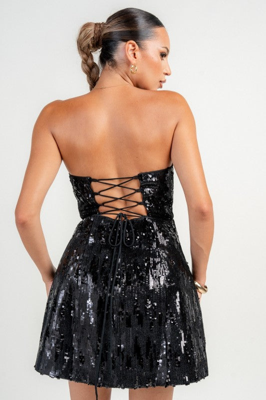 Effortlessly turn heads in our strapless sequin mini dress with a corset back. The form-fitting design will accentuate your curves, while the sequin detailing adds a touch of glamour. Perfect for any special occasion, this dress will make you stand out from the crowd.