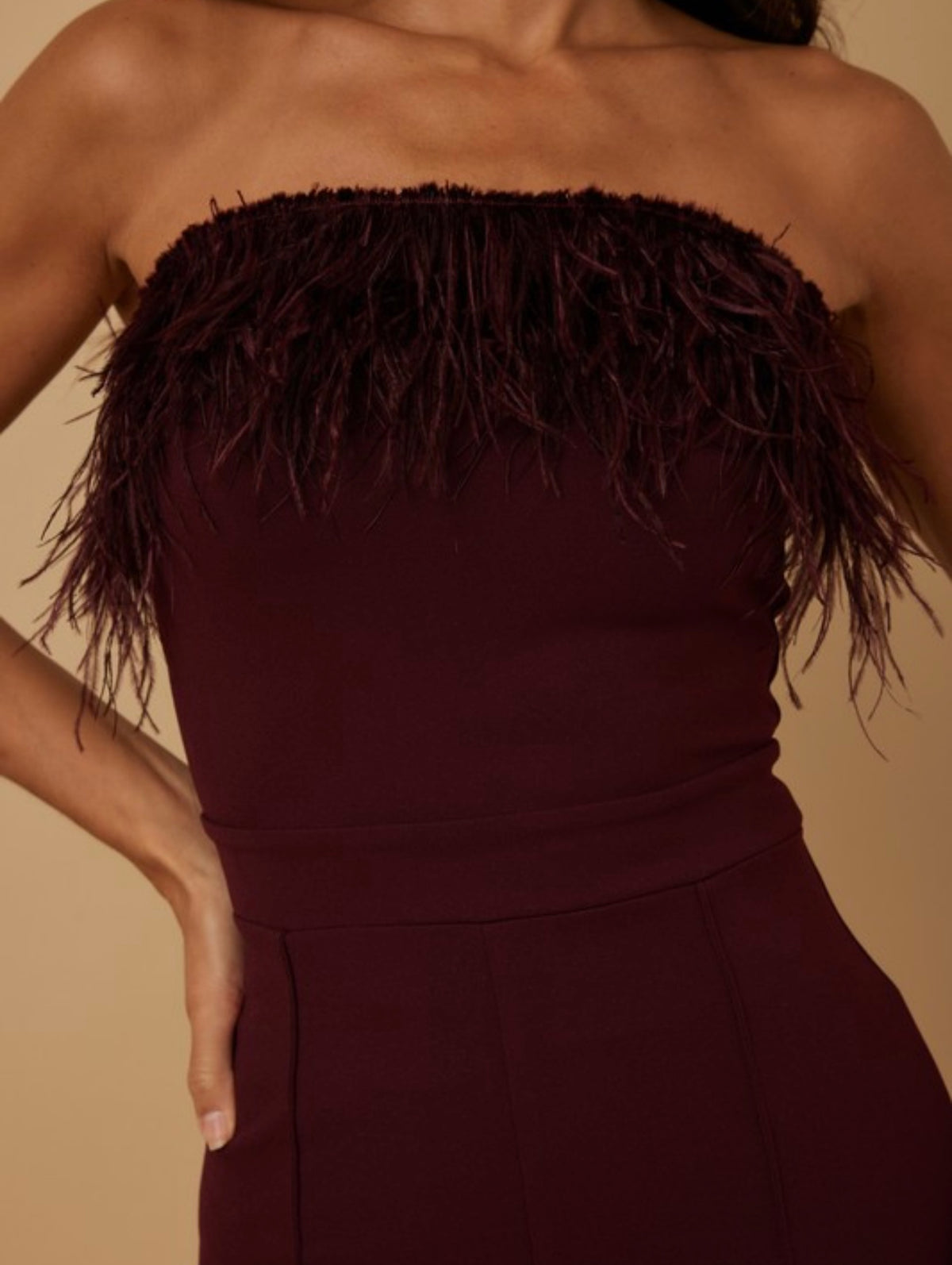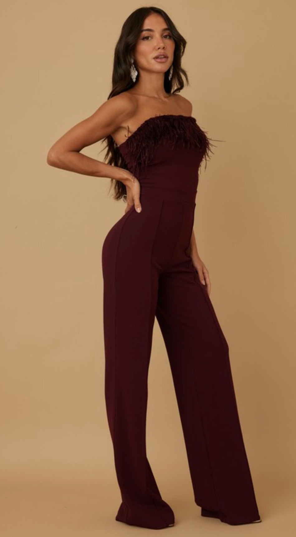 Make a bold statement with this burgundy strapless jumpsuit, featuring a glamorous feather trim along the bodice for a touch of drama and elegance. The wide-leg silhouette flows gracefully, creating a striking and flattering shape. Perfect for formal events or upscale evenings, this jumpsuit exudes confidence and sophistication, blending timeless allure with contemporary flair.