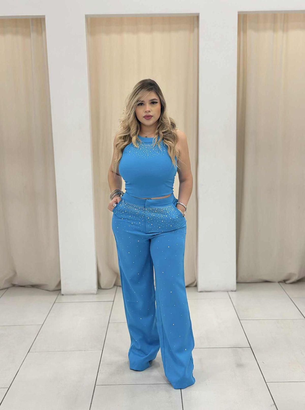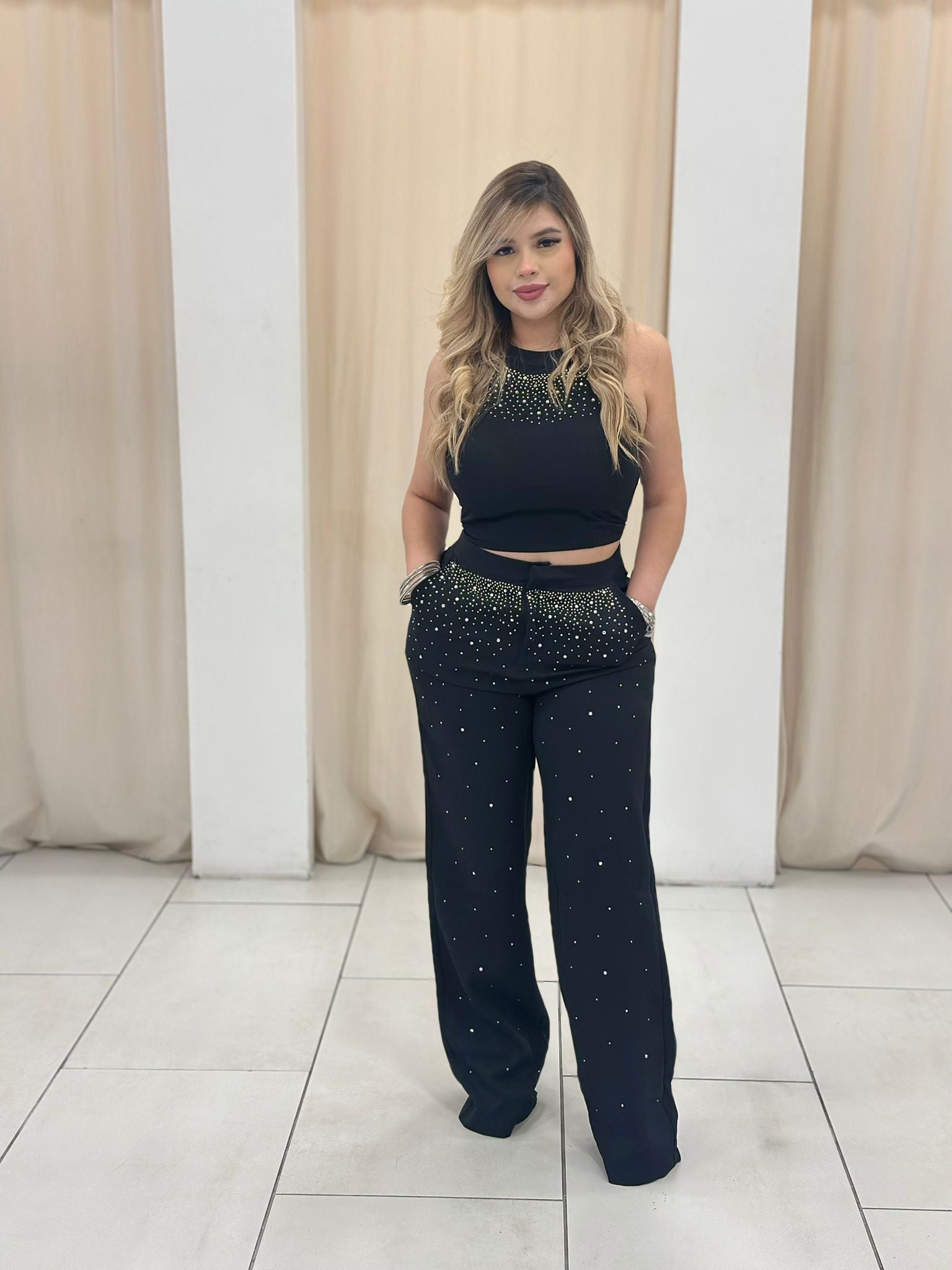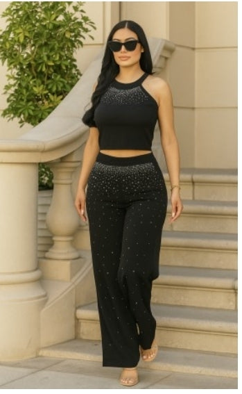 Introducing the Kevin Rhinestone Set - a stylish and sophisticated ensemble perfect for any formal occasion. Featuring a halter top and dressy wide leg pants adorned with sparkling rhinestones, this set is sure to make a statement. Elevate your look with this glamorous and chic outfit.