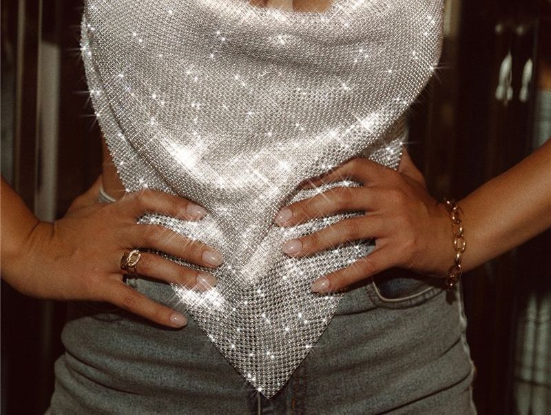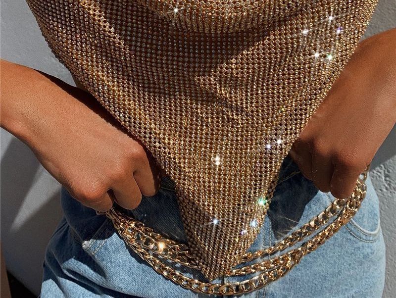 The Larissa Party Top features a cowl neck, rhinestone detailing, and an open back with a tie neck and back closure. Elevate any event with this stylish and sophisticated top, perfect for a night out or a special occasion.