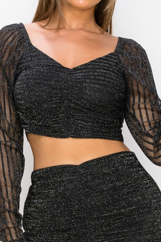 Ruched Glittery Mesh Sleeve Top & Skirts Set