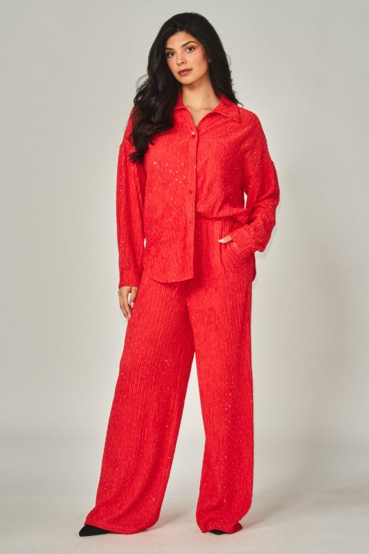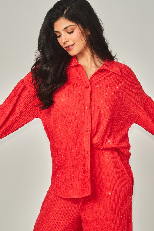 2 Piece set. Crinkled Rhinestone Collared Long Sleeve Blouse, Wide Leg Pants. button down top and flowy bottoms - lounge wear set 92% Polyester, 8% Spandex